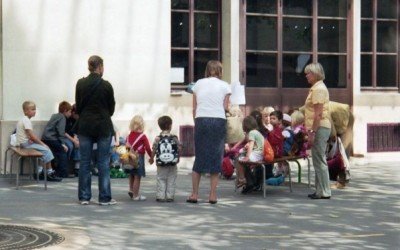 Saavuimme pikkuisen myöhässä, parkkeerasin kielletylle livraison-paikalle (maksamatta) ja jätin hätävilkut paikalliseen tapaan päälle, ryysiessämme raput ylös kävelykadulle missä koulu sijaitsee.