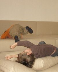 Vasemmalla poikien sohvahepuli (yliväsymyksellä sormensa pelissä ?!) ja oikealla näkymä parvekepippaloista naapuritornitalot taustalla. Pojista oli hurjan jännää katsella alas yhdeksännestä kerroksesta ja ihastella pikkuruisia autoja alhaalla – eksoottista vaihtelua meidän kotipihastamme.