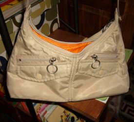 Mikrokuituinen beige oranssivuorinen Gap-minijippo, jossa puolitusinaa pikkutaskuja ulkopuolella – mutta niin pieniä ettei niihin mahdu kuin metrolippu, jos sekään. Aivan liian pieni, meikkipussikaan ei mahdu sinällään vaan sisältö pitää purkaa.