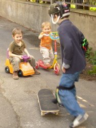 Yllä pligaat menotunnelmissa kujalla naapurin pojan kanssa, sekä sinisateemme monikossa – valkoinen alkaa sekin kukkia ja kiriä sinistä kiinni huumaavalla tuoksullaan ja rönsyilevillä kukkaryppäillään.