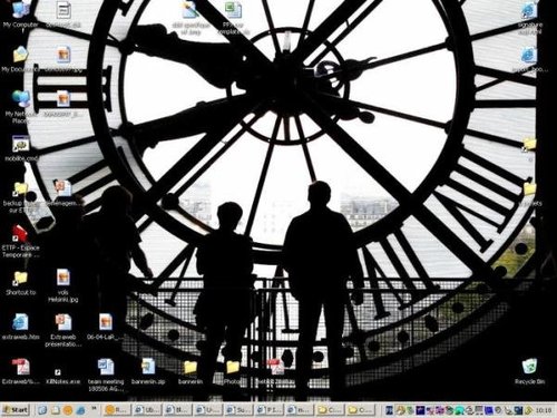 Alla työkoneeni työpöytä, jossa komeilee Musée d’Orsayn kello sisältä nähtynä. Museorakennus oli ammoin rautatieasema ja mielestäni Pariisin huikeimpia nähtävyyksiä, etenkin arkkitehtuurinsa puolesta.