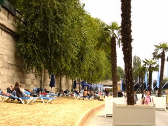 Sää oli sittenkin suotuisa ja suunnistimme innolla katsastamaan eilen mainostamaani Paris-Plage -tapahtumaa Seinen rantabulevardeille heti aamuaskareitten jälkeen. Melkein koko matka sujui pyöräteillä, eikä tarvinnut kovasti soluttautua pligatsujen kanssa Pariisin autoliikenteeseen – onneksi.