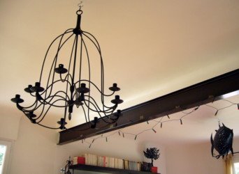 Un lustre et un poisson "Arizona Dream" ont retrouvé une place dans notre salon – salle à manger, après plusieurs années d’exil dans la cave. Nous avons également installé des étagères pour livres, des patères, des goulottes pour tableaux et des crochets pour la chambre d’enfants.