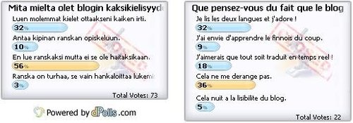 Quant à l’analyse des résultats, la plupart des lecteurs ne voient pas le bilinguisme d’un mauvais oeil, voire y trouvent leur compte en lisant les deux langues. Je ressens une fierté toute particulière en découvrant que mon blog donne envie d’apprendre le français – ou même le finnois ! Trois personnes en tout ont toutefois osé prétendre l’affichage double comme quelque chose de négatif (les deux abonnés de Blogilista que je viens de perdre ?!?!).