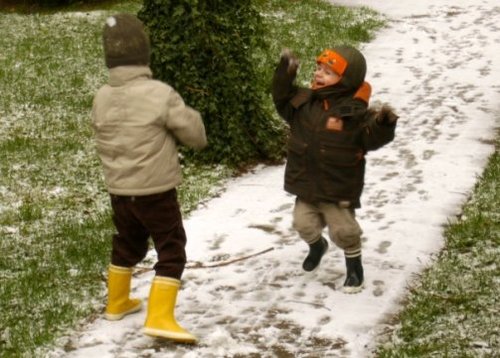 NDLR : La boule blanche sur la tête de l’aîné n’est pas un pompon mais bel et bien une boule de neige, oeuvre de son petit frère reproduisant instinctivement les gestes millénaires…