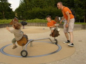 Nous avons failli avoir une attaque en voyant le petit cascadeur en herbe sauter du manège à toute vitesse, mais heureusement l’incident s’est soldé par un gros bleu au front et un petit bobo à la jambe. En regardant les photos le soir, nous découvrîmes que j’avais immortalisé le moment fatidique sans m’en apercevoir…