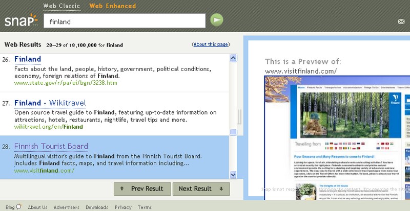Snap Shots taas on tuttu monilta eri saiteilta add-on -toimintona, jolla on mahdollista esikatsella linkin takana piilevä sivu. Mutta se on myös hakukone, joka ehdottaa hakusanoja kuten esim Google Suggest, ja hakutuloksissa voi siirtyä helposti kuvasta toiseen näppiksen nuolien avulla.