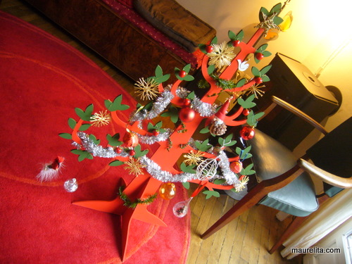 Tänä vuonna vietämme joulun Suomessa, mutta joulupuu oli saatava ! Hankimme paikallisesta puutarha- ja askarertelukaupasta puulevystä tehdyn joulupuun, jonka saa itse maalata ja koristella makunsa mukaan. Truffaut-kaupan esitteessä puusta on tehty sininen joulukalenteri kirjekuorineen ; meillä taas ollaan perinteisemmällä punavihreällä linjalla.