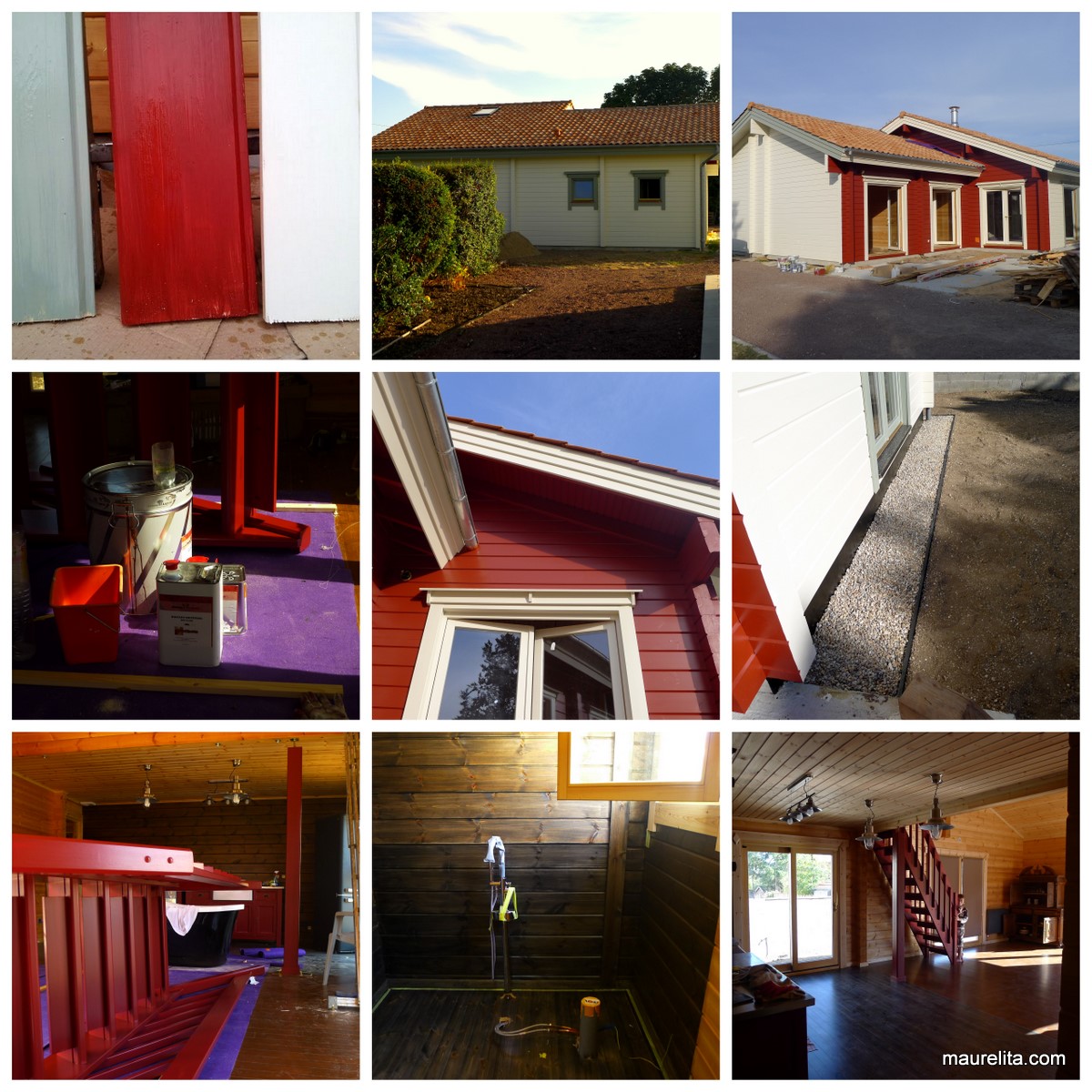 Punaisten seinien vuorilaudat maalattiin samalla valkoisella kuin muut seinät, joille puolestaan tuli vihertävänharmaat ikkunanpuitteet. Taloa tuli maalaamaan bretagnelainen Henri Lanchou mukanaan valitsemamme Tikkurilan maalit ; suosittelijana tietenkin suomalainen talonrakentajamme Maisons Hietala.