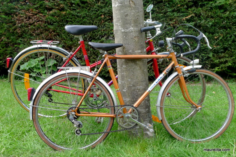 Mes trois petites reines: VAE Giant (vendu), mon sac de courses… et le tout fraîchement acquis Peugeot vintage.