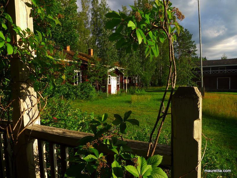 Ci-contre un clin d'oeil à nos anciens bâtiments en Finlande au rouge de Falun, la peinture à la terre rouge ; Fe2O3·H2O de son petit nom. Même avec de la pluie les maisons colorées donnent une touche de gaîté au milieu de toute cette verdure, et le rouge contraste à merveille avec les portes et contours de fenêtres en blanc.