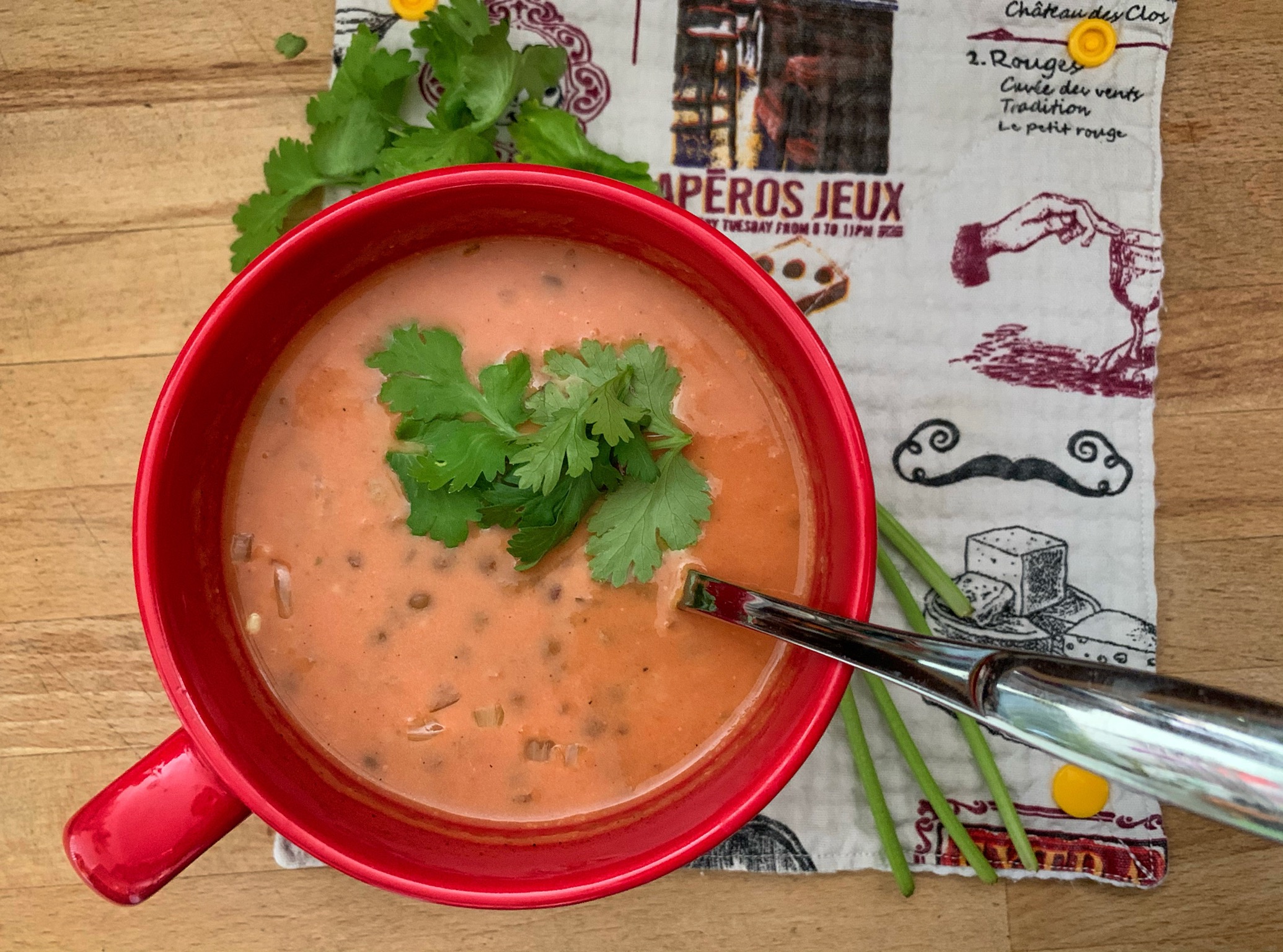 La rentrée approche à grands pas malgré les vilains virus qui circulent, et avec la météo mitigée on a envie de petits plats mijotés. Voici ma recette préférée du moment, une soupe de lentilles corail avec une note d'exotisme avec du lait de coco et du curry – à épicer selon les affinités de chacun.