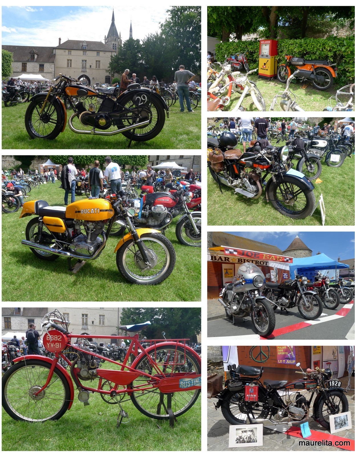 Upea auringonpaiste vanhojen moottoripyörien näyttelyyn tänään, Dourdan-pikkukaupungin linnan pihalla, Pariisista lounaaseen.